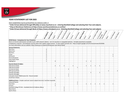 Glenfield College 2025 Stationery Pack Year 9