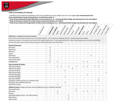 Glenfield College 2025 Stationery Pack Year 10