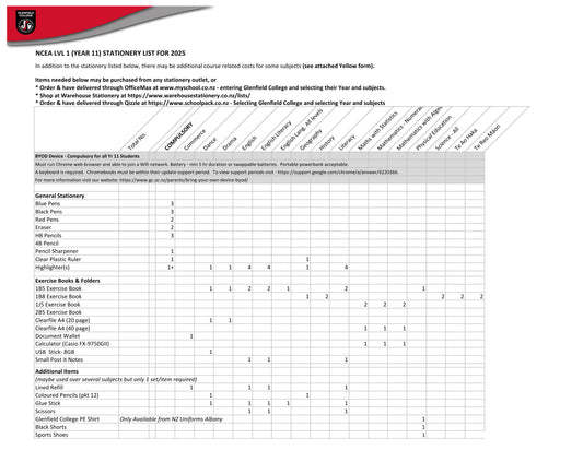 Glenfield College 2025 Stationery Pack Year 11