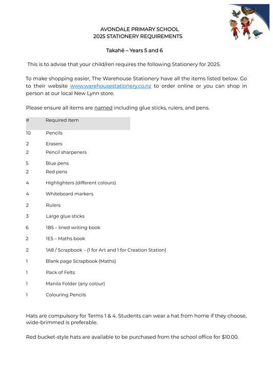 Avondale Primary School Stationery Pack 2025 Takahe Year 5 and 6