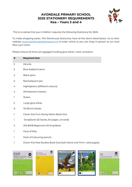 Avondale Primary School Stationery Pack 2025 Kea Year 3 & 4