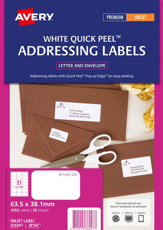 Avery Premium Inkjet Label White J8160-50 635 x 38.1mm 50 Sheets [1050 Labels]
