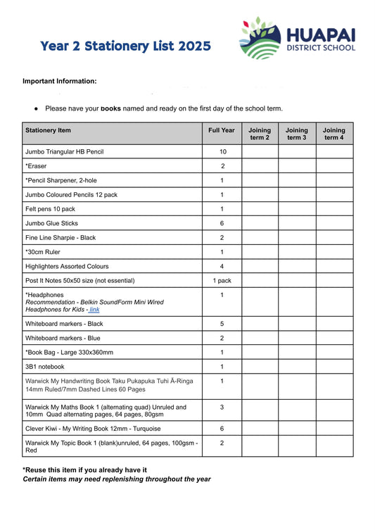 Huapai District School Stationery Pack 2025 Year 3 & 4
