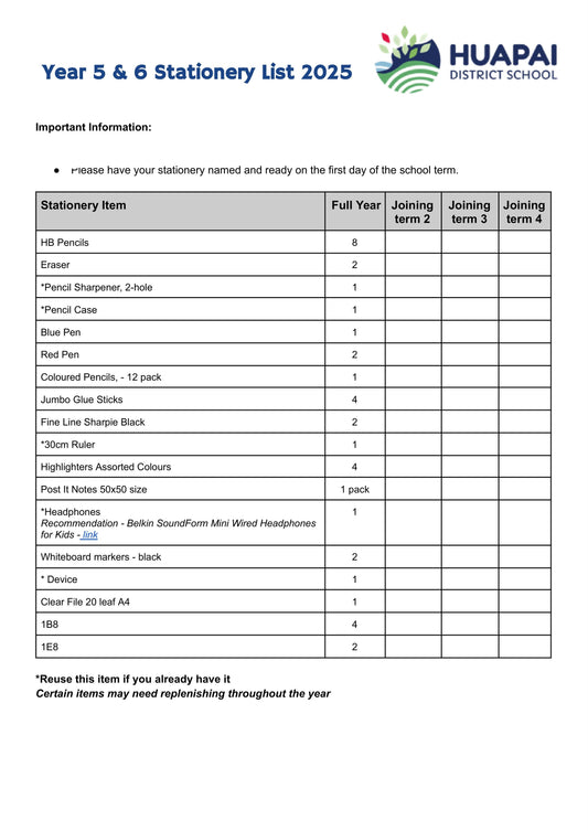 Huapai District School Stationery Pack 2025 Year 5 & 6