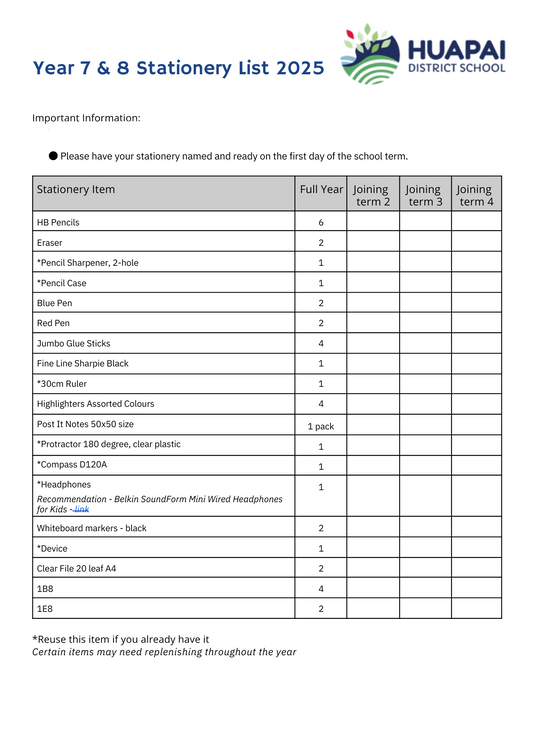 Huapai District School Stationery Pack 2025 Year 7 & 8