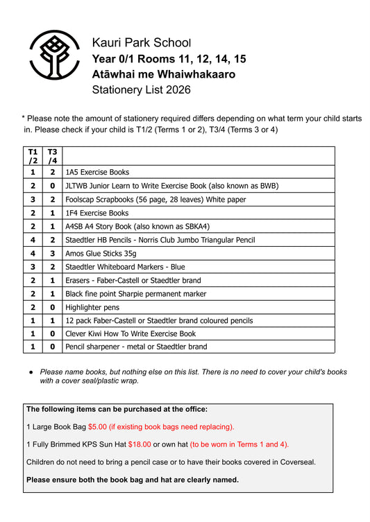 Kauri Park School Stationery Pack 2026 Year 0 & 1