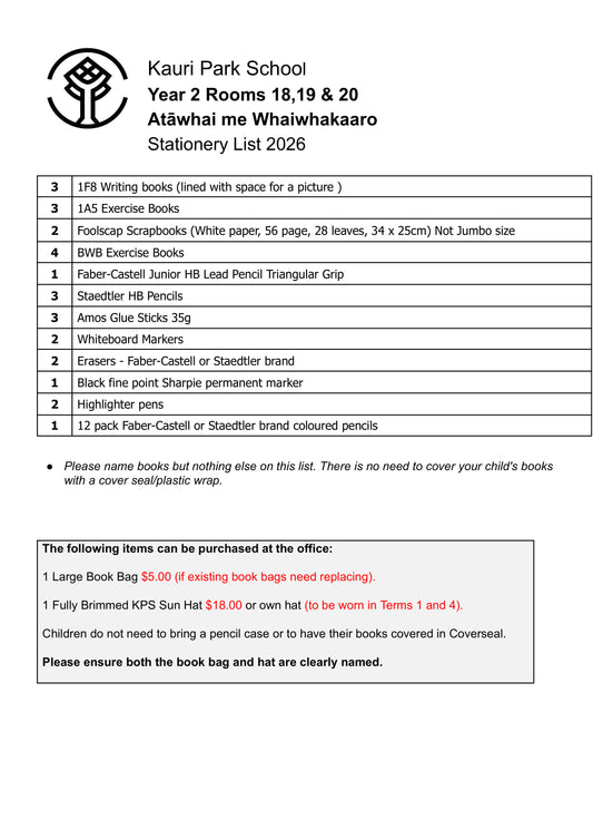 Kauri Park School Stationery Pack 2026 Year 2