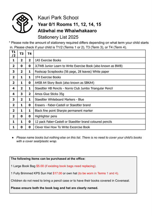 Kauri Park School Stationery Pack 2025 Year 0 & 1