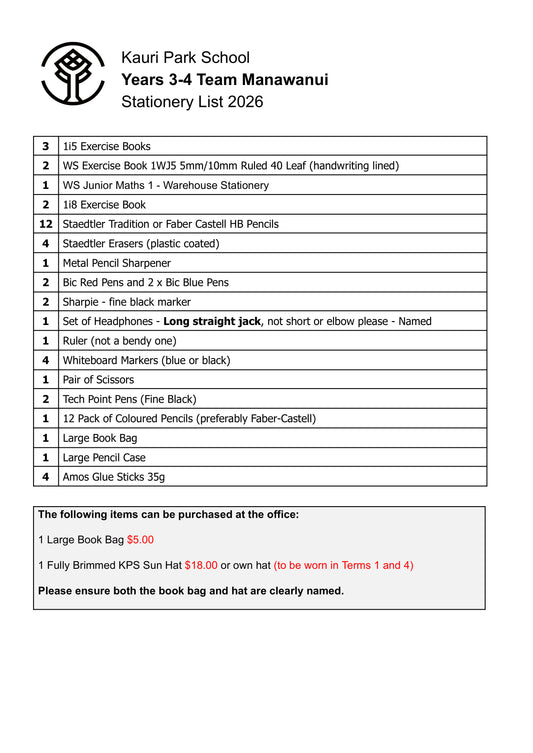 Kauri Park School Stationery Pack 2026 Year 3 & 4 Team Manawanui