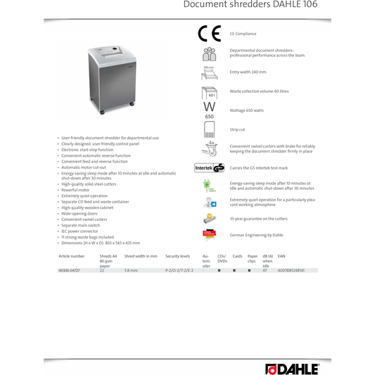 Dahle Office Paper Shredder P2 60L Strip-Cut