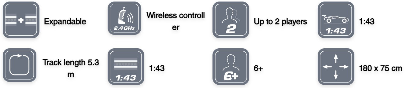 With loops, straightaways, crossings, and more, every race is a new adrenaline rush. Thanks to the 2.4 GHz wireless hand controllers, you’ll enjoy maximum freedom of movement as you race head-to-head without tangled wires.
